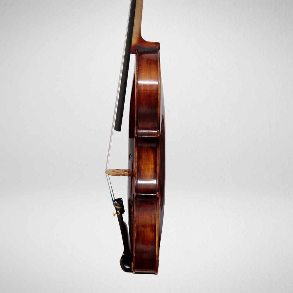 Lindo violino, com excelente construção e finalização realizada no Brasil pelo renomado Atelier dos Violinos. Neste instrumento foi feito um verniz misto à óleo, e montado com peças de qualidade tendo um cavalete Teller Germany 3 estrelas envelhecido, alma de abeto alemão envelhecida, colocação de um jogo de encordoamento Thomastik Alphayue, espelho em ébano, acessórios (cravelhas, estandarte, queixeira e botão) em ébano com detalhes dourado. Violino indicado para estudantes intermediários e violinistas de nível intermediários.