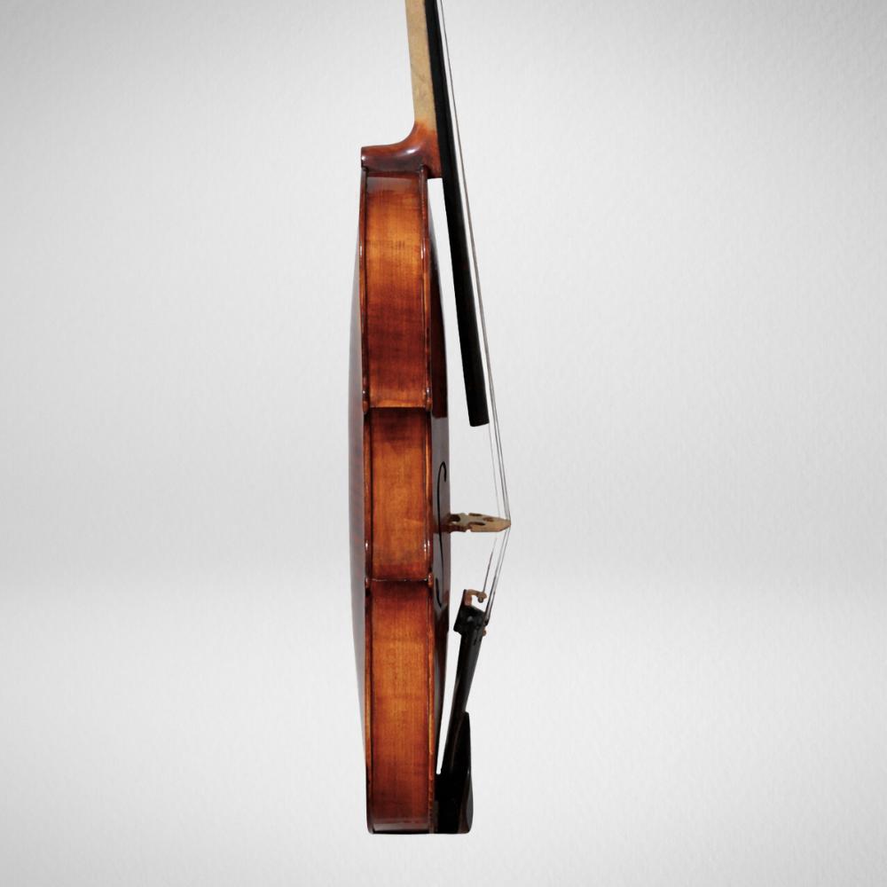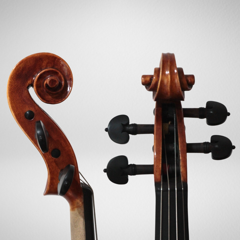 Lindo violino, com excelente construção e finalização realizada no Brasil pelo renomado Atelier dos Violinos. Neste instrumento foi feito um verniz misto à óleo, e montado com peças de qualidade tendo um cavalete Teller Germany 3 estrelas envelhecido, alma de abeto alemão envelhecida, colocação de um jogo de encordoamento Thomastik Alphayue, espelho em ébano, acessórios (cravelhas, estandarte, queixeira e botão) em ébano com detalhes dourado. Violino indicado para estudantes intermediários e violinistas de nível intermediários.